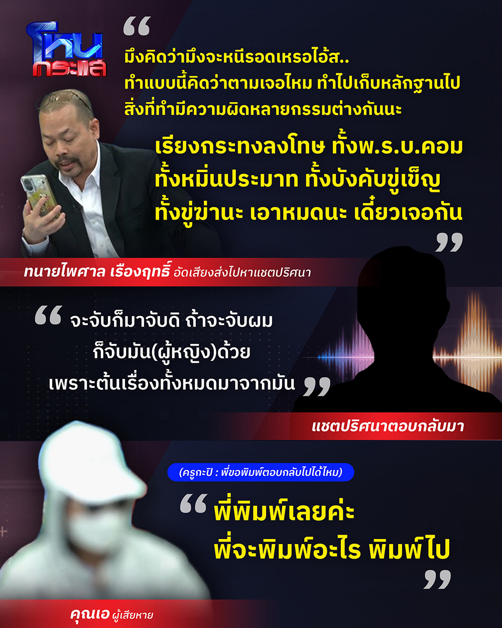 แต่ระหว่างที่ในรายการกำลังสับสนเรื่องข้อเท็จจริง เพราะไม่มีใครพูดตรงกันสักอย่าง จู่ๆ ก็มีแชตส่งมา เป็นแชตของเฟซบุ๊กที่คุณเอเชื่อว่าเป็นนายอาคม พิมพ์ส่งมาไม่หยุด ทั้งที่นายอาคมถูกควบคุมตัวอยู่กับตำรวจ และยังอยู่ในสายโฟนอิน ทำให้ชัดเจนว่านายอาคมไม่ได้เป็นคนพิมพ์จริงๆ