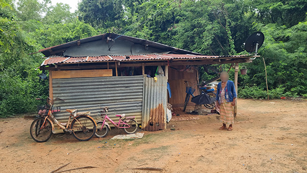 จากนั้นผู้สื่อข่าวได้เดินทางไปยังบ้านหลังดังกล่าว พบกับหญิง อายุ 77 ปี อยู่กับเหลนสาว 2 คน คือ เด็กหญิง อายุ 13 ปี เรียนอยู่ชั้น ม.1 และเด็กหญิง อายุ 8 ขวบ เรียนอยู่ชั้น ป.2 โดยอาศัยในกระต๊อบที่ผนังล้อมด้วยเศษกระเบื้อง และสังกะสีเก่าผุพังเพื่อกันแดดฝน หลังคามุงด้วยสังกะสีที่ขึ้นสนิมและเป็นรู ปลูกอยู่ในที่สาธารณประโยชน์ ห้องน้ำที่สร้างไม่เสร็จมีเพียงอิฐบล็อกที่ก่อได้ไม่ถึงครึ่งและไม่มีหลังคากันแดดฝน เป็นภาพที่น่าเวทนาสงสารมาก