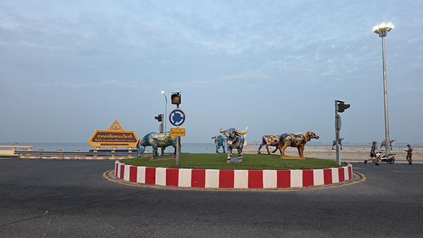 ต่อมา ผู้สื่อข่าวได้เดินทางไปยัง ถนนเฉลิมพระเกียรติ บริเวณสะพานใหม่ชลบุรี ซึ่งเป็นวงเวียนควาย พื้นที่อำเภอเมือง จังหวัดชลบุรี ได้พบกับวงเวียนดังกล่าวซึ่งมีรูปปั้นควาย จำนวนหลายตัวแต่ละตัวจะมีลวดลายเป็นสัญลักษณ์ซึ่งเป็นฝีมือการเพนต์ลวดลายจากเด็กนักเรียนของหลายโรงเรียนที่มีการวาดลวดลายในงานประกวดงานประจำปีวิ่งควายของจังหวัดชลบุรี