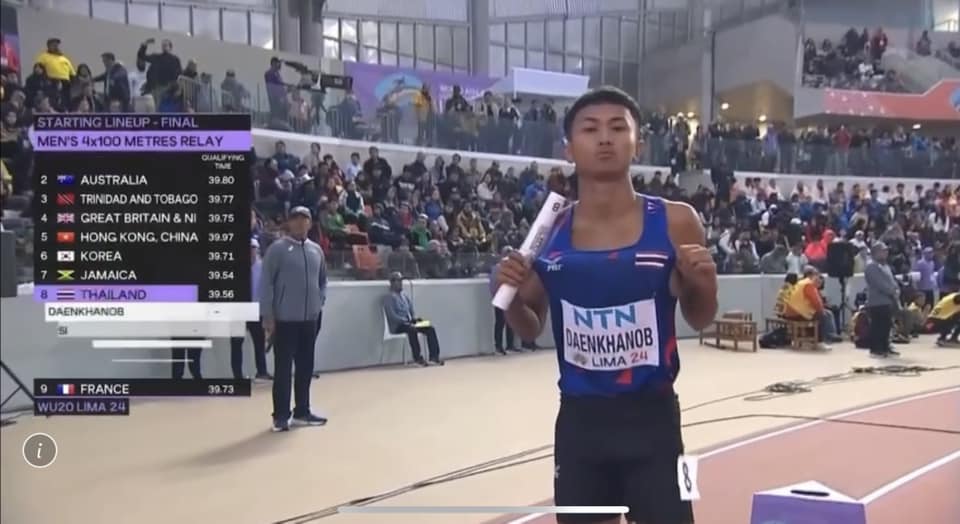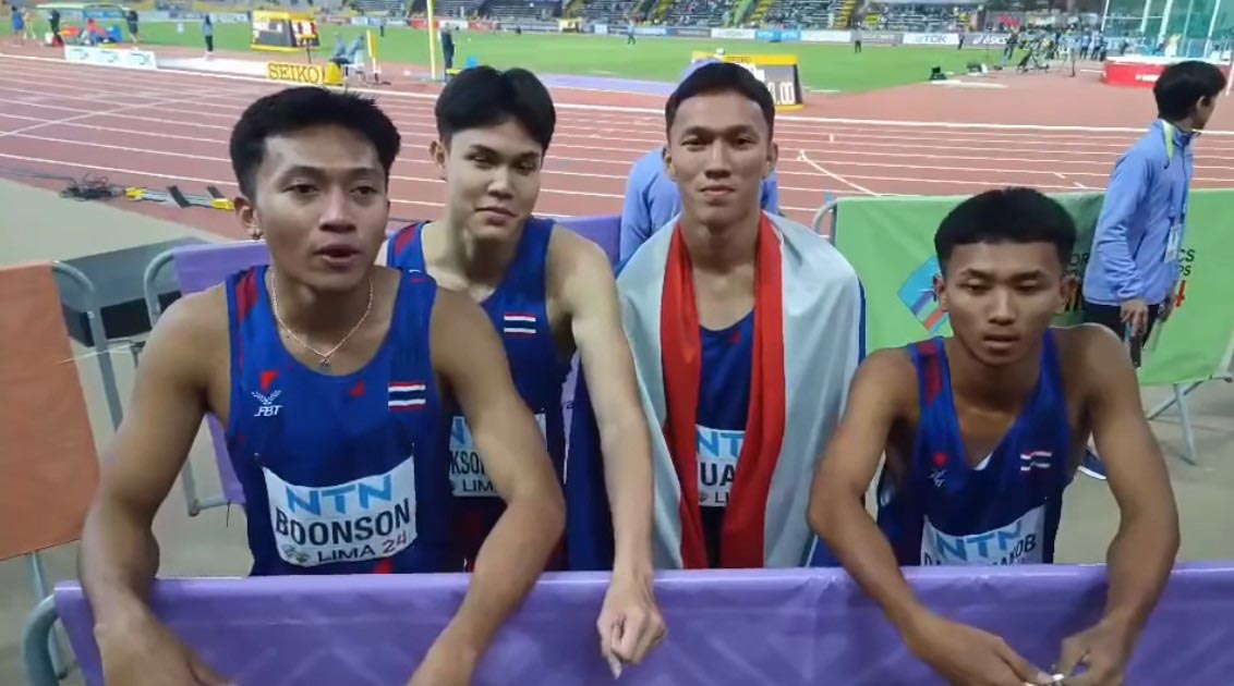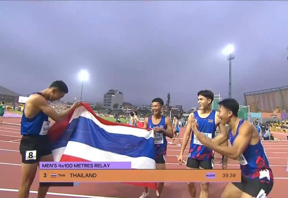 ทำผลงานประวัติศาสตร์ คว้าเหรียญทองแดง วิ่ง 4x100 เมตรชาย กรีฑาเยาวชน 2024 สถิติ 39.39 วินาที ทำลายสถิติประเทศไทยรุ่น 20 ปี