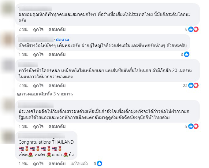 หลังโพสต์ดังกล่าวเผยแพร่ออกไปมีคนเข้ามาแสดงความคิดเห็นชื่นชมนักกรีฑาทั้ง 4 คนเป็นจำนวนมาก เช่น “น้องๆ ทั้ง 4 คน สุดยอดมากค่ะ เก่งมากๆ เลย” , “เป็น 1ใน3 ของยอดนักวิ่งเยาวชนโลกแล้วครับ สุดยอดๆ” , “ขอขอบคุณนักกีฬาทุกคนและสมาคมกรีฑา ที่สร้างชื่อเสียงให้ประเทศไทย นี่มันคือระดับโลกนะครับ” , “สุดยอดมากๆ ดีใจไปกับน้องๆ ทุกคน”