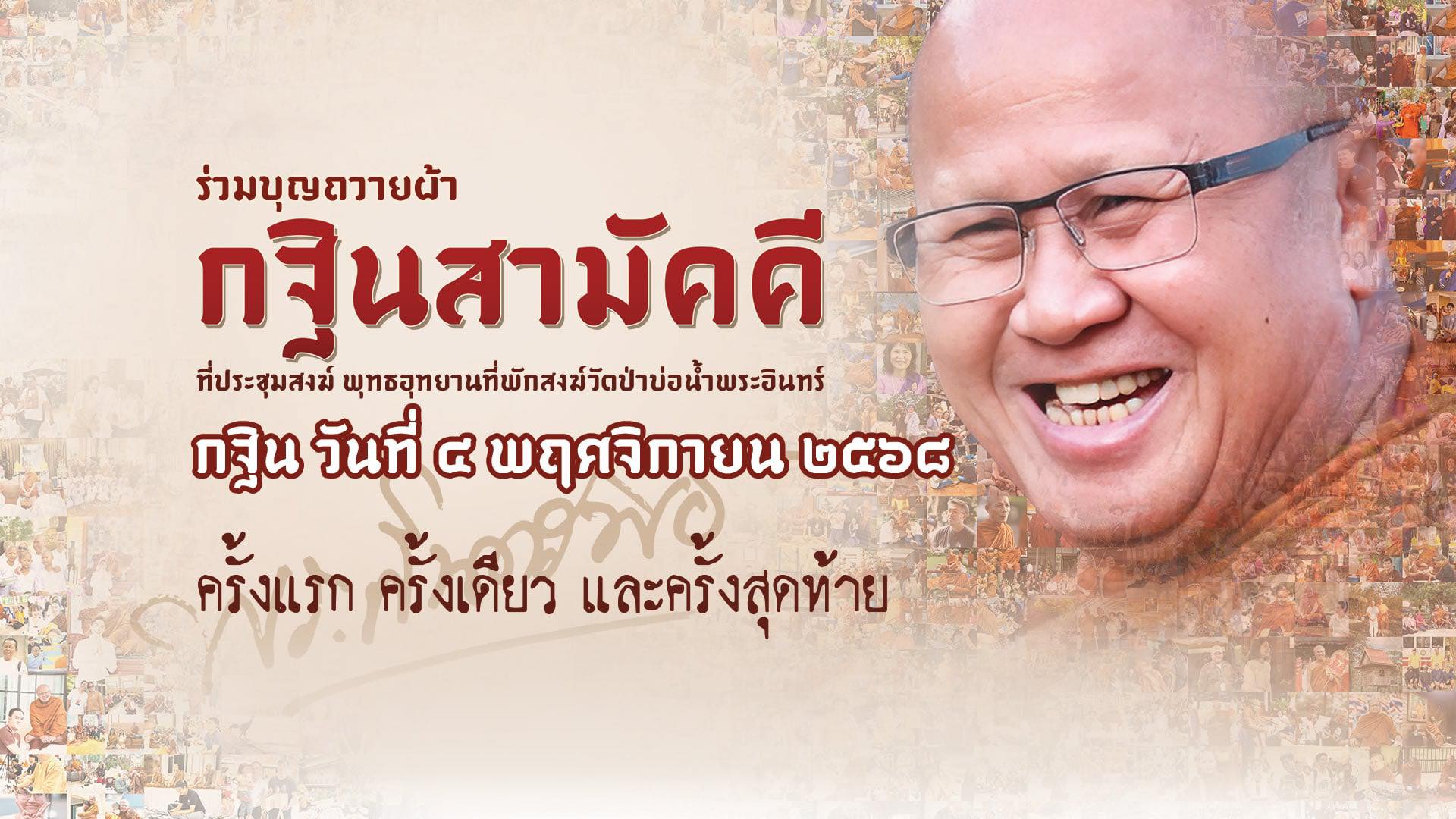 ที่พุทธอุทยานวัดป่าบ่อน้ำพระอินทร์ ตำบลช่องเม็ก อำเภอสิรินธร จังหวัดอุบลราชธานี หลวงตาสินทรัพย์ จรณธัมโม (พระสิ้นคิด) ได้เปิดเผยถึงที่มาในการจัดกฐินสามัคคีครั้งประวัติศาสตร์ครั้งแรก ครั้งเดียว และครั้งสุดท้ายในชีวิตการบวชของหลวงตาสินทรัพย์ ในวันที่ 4 พ.ย.ที่จะถึงนี้ว่า