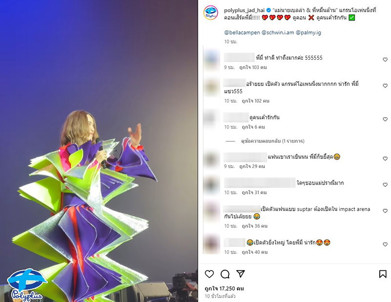 ขณะที่สื่อโซเชียลของโพลีพลัสได้โพสต์ภาพพร้อมเขียนข้อความว่า “แม่นายเบลล่า & พี่หมื่นล้าน” แกรนด์โอเพนนิ่งที่พี่มี่ ดูคอนเสิร์ต X ดูคนเขารักกัน ✓” พร้อมแท็กหา เบลล่าและ วิล ชวิณ