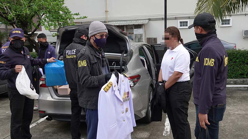 โดยระหว่างที่ชุดสารวัตรแจ๊ะได้ล่าติดตามพบว่าคนร้ายได้หลบหนีไปกบดานอยู่กับ “หมอดูชื่อดัง” ตระเวนเช่าห้องพักรายวันอยู่ในละแวก ถ.ลาดกระบัง โดยจะเปลี่ยนที่พักทุกๆวันไม่ให้ซ้ำ เพื่อป้องกันการติดตามของเจ้าหน้าที่ กระทั่งวันที่ 5 ต.ค.67 ชุดสืบสวนได้พบคนร้ายกำลังจะย้ายที่พักจึงทำการจับกุมตัวไว้ทันที ซึ่งหลังการจับกุมชุดสืบสวนได้ขยายผลตรวจค้นพบ ชุดข้าราชการ (ชุดขาว) ติดเครื่องราชฯ , เสื้อคลุมตราสำนักนายกรัฐมนตรี , เสื้อคลุมตรารัฐสภา , บัตรตัวแทนพรรคการเมืองชื่อดัง ซุกซ่อนอยู่ในรถยนต์เช่า โดยไปจอดแอบไว้อยู่ภายในโรงแรมแห่งหนึ่งย่านอ่อนนุช และจากการตรวจสอบโทรศัพท์พบภาพถ่ายคู่กับนักการเมืองชื่อดังหลายท่าน มีภาพถ่ายการสวมชุดข้าราชการ (ชุดขาว) หลายภาพ และจากการสอบถามบุคคลในพื้นที่ละแวกที่คนร้ายหลบหนีไปกบดานนั้นได้ข้อมูลว่า คนร้ายมักแอบอ้างว่าตนเองมีตำแหน่งทางการเมือง ลักษณะอวดกับพนักงานหลายๆแห่งในพื้นที่