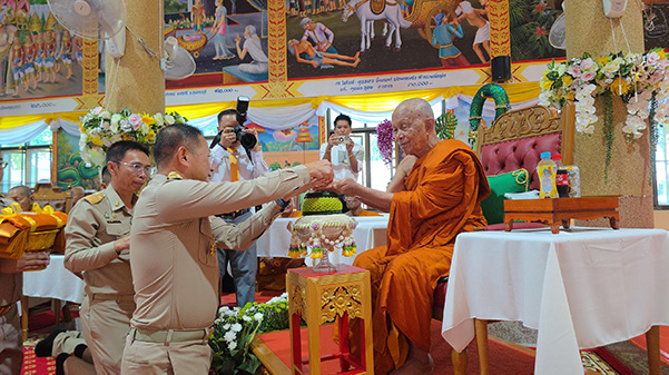 โดยช่วงเช้าได้จัดพิธีทำบุญตักบาตรพระภิกษุ สามเณร จำนวน 80 รูป โดยมีพระพรหมวชิรดิลก (สมาน สุเมโธ ป.ธ.9 ,ดร.) ที่ปรึกษาเจ้าคณะภาค 9 (ธ) เจ้าอาวาสวัดป่าแสงอรุณ เมตตาเป็นประธานฝ่ายสงฆ์ โดยมีพระมหาเถระร่วมงานอย่างพร้อมเพรียง