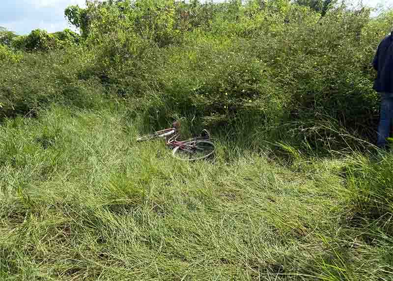 เจ้าหน้าที่ตรวจสอบจุดเกิดเหตุ เป็นพงหญ้าสูงปกคลุม ห่างจากถนนประมาณ 20-30 เมตร พบศพชาย อายุ 55 ปี ชาว ต.ตาก้อง อ.เมือง นครปฐม คาดว่าน่าจะเสียชีวิตมาแล้ว 2-3 วัน โดยร่างผู้เสียชีวิตนอนหงายอยู่บนถุงกระสอบปุ๋ย สวมเสื้อแขนสั้นลายทหาร กางเกงขาสั้นสีดำ บริเวณข้อเท้าด้านซ้ายมีโซ่รัดแน่น ล็อกด้วยแม่กุญแจติดกับต้นไม้ มีรองเท้าแตะสีชมพูตกอยู่ใกล้กัน และมีผ้ากันเปื้อนสีฟ้าแขวนอยู่บนต้นไม้ที่ผูกกับโซ่ ใกล้กันพบขวดน้ำหวานสีแดง 1 ขวด, น้ำเปล่า 1 ขวด, น้ำอัดลมสีม่วง 1 ขวด, ซองยาฆ่าหญ้า จำนวน 3 ซอง และจักรยานสีชมพูล้มอยู่ใกล้ที่พบศพ เจ้าหน้าที่ตำรวจชุดพิสูจน์หลักฐาน 7 เก็บพยานหลักฐานในที่เกิดเหตุ