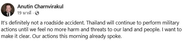 นายอนุทิน ชาญวีรกูล นายกรัฐมนตรีและรัฐมนตรีว่าการกระทรวงมหาดไทย โพสต์ข้อความเป็นภาษาอังกฤษว่า “It’s definitely not a roadside accident. Thailand will continue to perform military actions until we feel no more harm and threats to our land and people. I want to make it clear. Our actions this morning already spoke.”