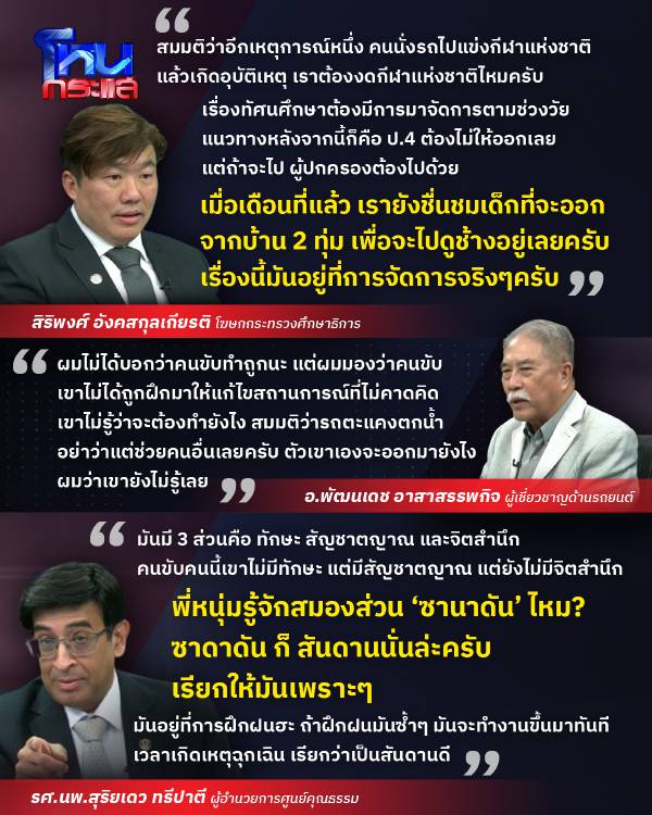 ขณะที่ รศ.นพ.สุริยเดว ชี้ว่า เวลาเกิดเหตุการณ์ลักษณะนี้ มันต้องใช้ 3 ส่วนประกอบกัน คือ ทักษะ จิตสำนึก และ สัญชาตญาณ เวลาเกิดเหตุฉุกเฉินแบบนี้ จิตสำนึกมันจะชัตดาวน์ ปิดการทำงานทันที จะเหลือแค่ทักษะ กับ สัญชาตญาณ ซึ่งสัญชาติญาณมันฝึกฝนได้ มันฝึกให้ซึมลึกลงไปในสันดานได้ เมื่อเกิดเหตุต่างๆ สัญชาตญาณของเรามันจะสั่งให้เราแก้ปัญหาต่างๆ โดยอัตโนมัติ แต่อย่างที่เห็นก็คือ คนขับคนนี้ อาจจะขาดทักษะ และขาดสัญชาตญาณที่ดี