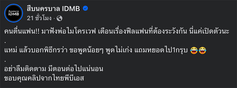 รวมถึงเพจ สืบนครบาล IDMB เอง ก็ได้นำคลิปช่วงดังกล่าวมาลง พร้อมแซวว่า “คนตื่นแฟน! มาฟังพ่อไมโครเวฟเตือนเรื่องฟีลแฟนที่ต้องระวังกัน นี่แค่เปิดตัวนะ แหม่… แล้วบอกพิธีกรว่า ขอพูดน้อยๆ พูดไม่เก่ง แถมหยอดไป 1 กรุบ”