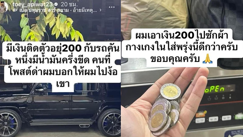 “มีเงินติดตัวอยู่ 200 กับรถ 1 คัน น้ำมันครึ่งขีด คนที่โพสต์ด่าผมบอกให้ผมไปง้อเขา ผมเอาเงิน 200 ไปซักผ้ากางเกงในใส่พรุ่งนี้ดีกว่าครับ ขอบคุณครับ”