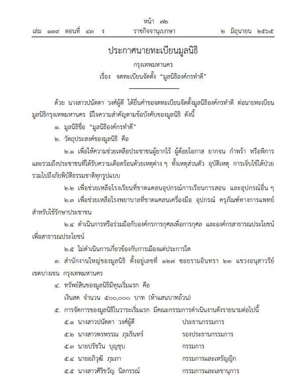 นอกจากนี้ ยังระบุชื่อ ‘ปนัดดา วงศ์ผู้ดี’ เป็นผู้ยื่นคำขอจดทะเบียนจัดตั้งมูลนิธิฯ และเป็นประธานกรรมการด้วยตัวเอง